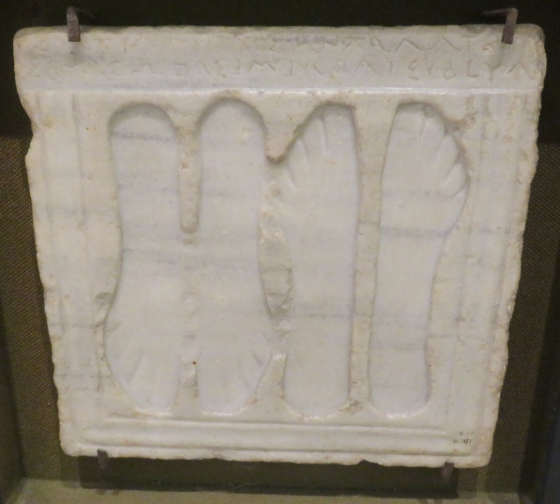 Not oops-stepped-on-a-wet-tile footprints but deliberately carved-into-marble outlines of feet. Some with toenails, some with sandal straps, some very slender, and some facing opposite another pair of feet.